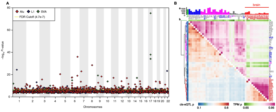 Figure 2. Recent findings using TE-eQTL. A Manhattan plot from Wang et al., (2017) displaying the significance of hundreds of Alu, L1 and SVA TE-eQTL, according to TE genomic location. B Heatmap of TE-eQTL (blue-red) and gene expression (green-pink) correlations across 44 tissues from the GTEx consortium. Adapted from Cao et al., (2020).