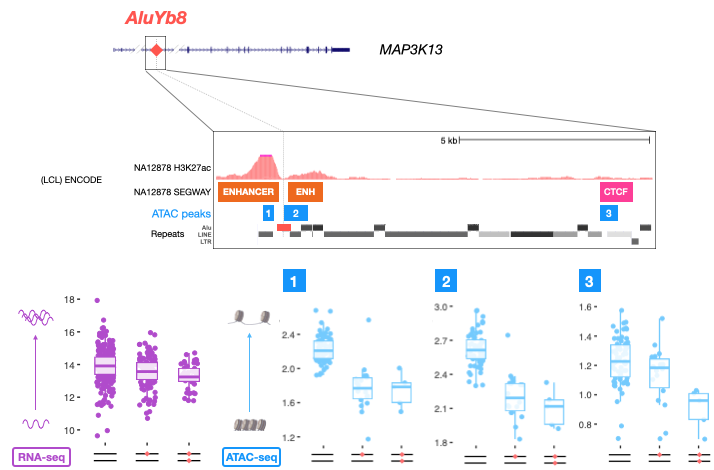 Figure 3. Figure 3. A candidate AluYb8 insertion in an enhancer of MAP3K13 is correlated to the reduction of chromatin accessibility at three ATAC-seq peaks mapped to TSS and CTCF sites (ATAC peaks 1, 2 and 3 and blue boxplots), as well as the reduction in expression of the gene as a whole (as seen by RNA-seq, purple boxplot). Adapted from Goubert et al., (2020a).