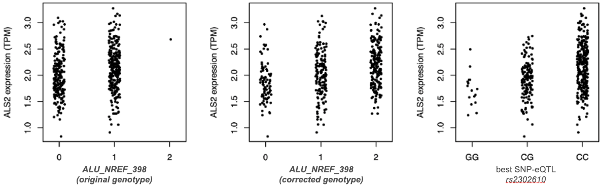 Figure 4. Errors in TE genotyping reduce the ability to detect TE-eQTL. In this example, only 1 homozygote for the TE insertion (“2”) was detected with a method based on a single reference genome (left, Sudmant et al,. 2015). Correction using a composite reference genome made of pairs of presence/absence alleles for each locus (centre) enhances the ability to detect a correlation between genotypes and ALS2 expression, as recapitulated by a SNP in linkage disequilibrium (right).
